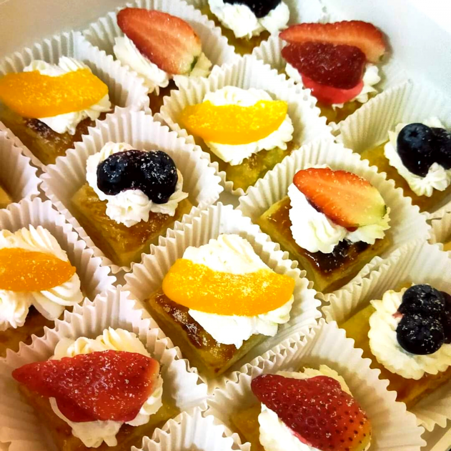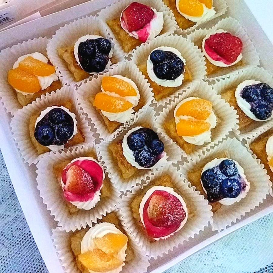 Pastry puff, fresh berries, canned peaches, non-dairy whipping cream, cream cheese, sugar
