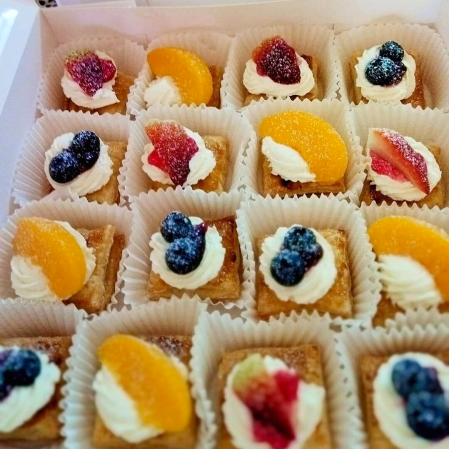 Mixed peaches and barries strudel baked with pastry puff and topped with cream cheese.