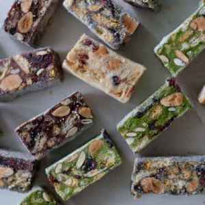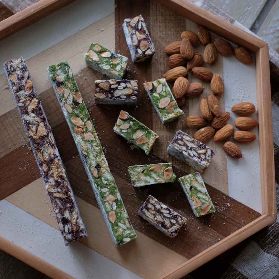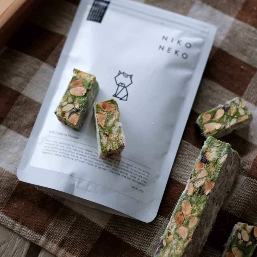 Marshmallow, butter, milk powder, Niko Neko matcha powder, nuts and berries