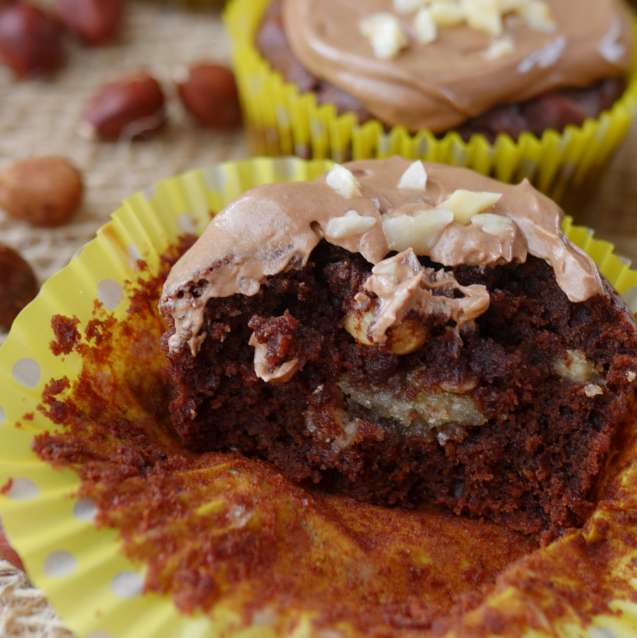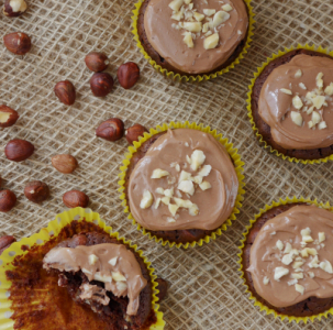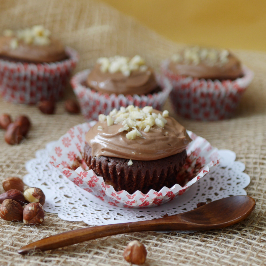We go full hazelnut with these cupcakes which come loaded with the little nutrient rich nut. A sweet hazelnut paste sits in the centre of the cupcake, which itself contains chopped hazelnuts for a nice crunch. It's topped with hazelnut heaven in the form of Nutella buttercream and finally finished with more chopped hazelnuts.