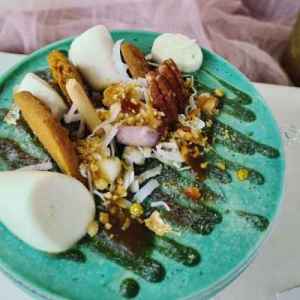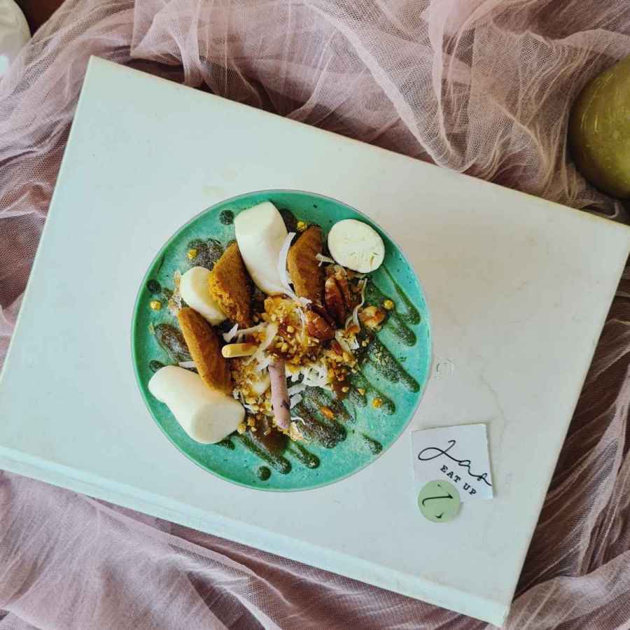 Pandan chiffon, gula melaka coconut floss, coconut cream