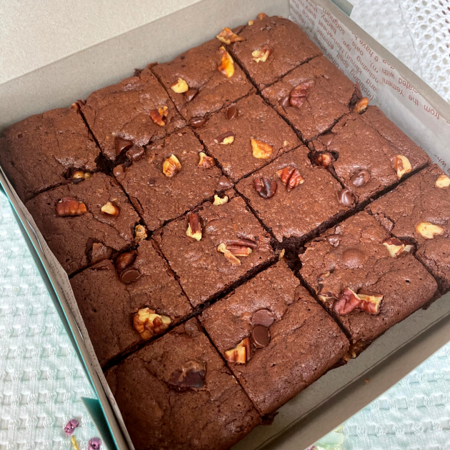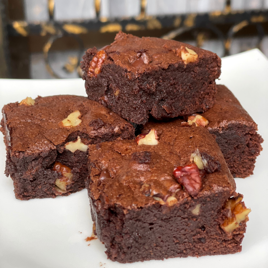 We use high quality bittersweet chocolate (70% cocoa) and dutch processed cocoa powder in our brownies. Toasted chopped pecans and walnuts add crunch and texture to our brownies.
