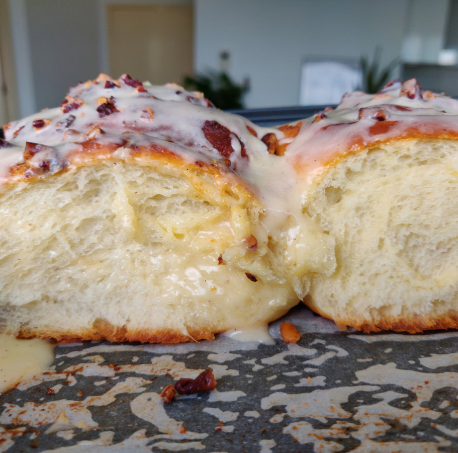 Few things are more comforting than pulling apart a freshly baked spiced roll, relishing it's heady aroma and savouring its fluffy texture. That buttery, yeasted dough is something special - each layer coated with cinnamon sugar, crushed pecans and topped with glaze that's made from 100% organic maple syrup.