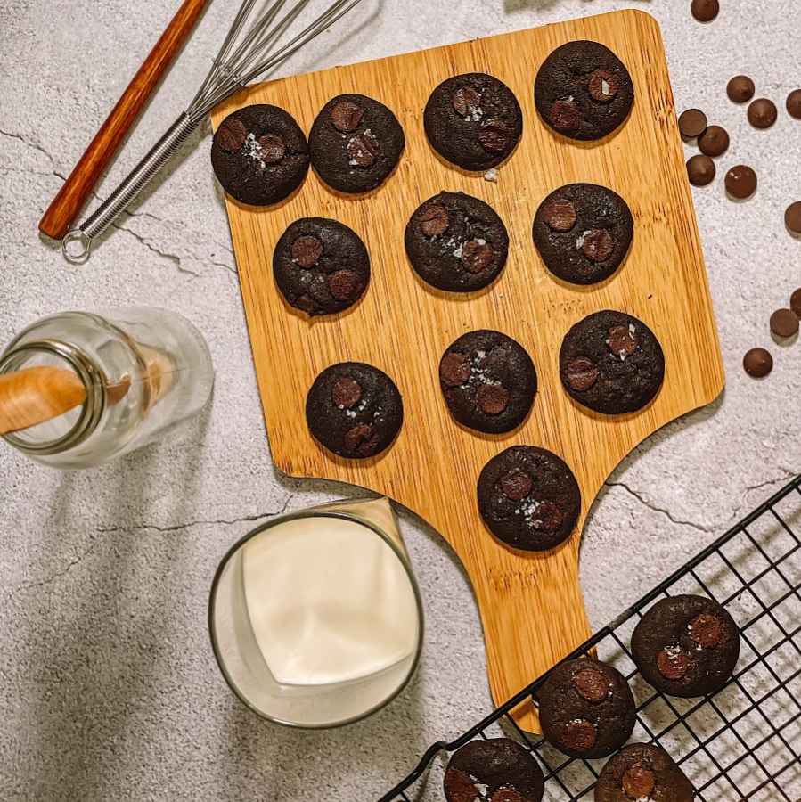 Crunchy chocolate chip cookies made with pure butter, Callebaut dark chocolate, and dark callets on top with a hint of sea salt flakes. Intense dark chocolate version with addition of two different cocoa powder that gives the beautiful black colour. Indulge in this irresistible chocolate loaded cookies!