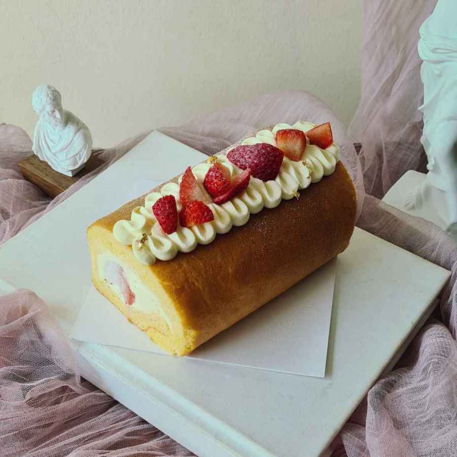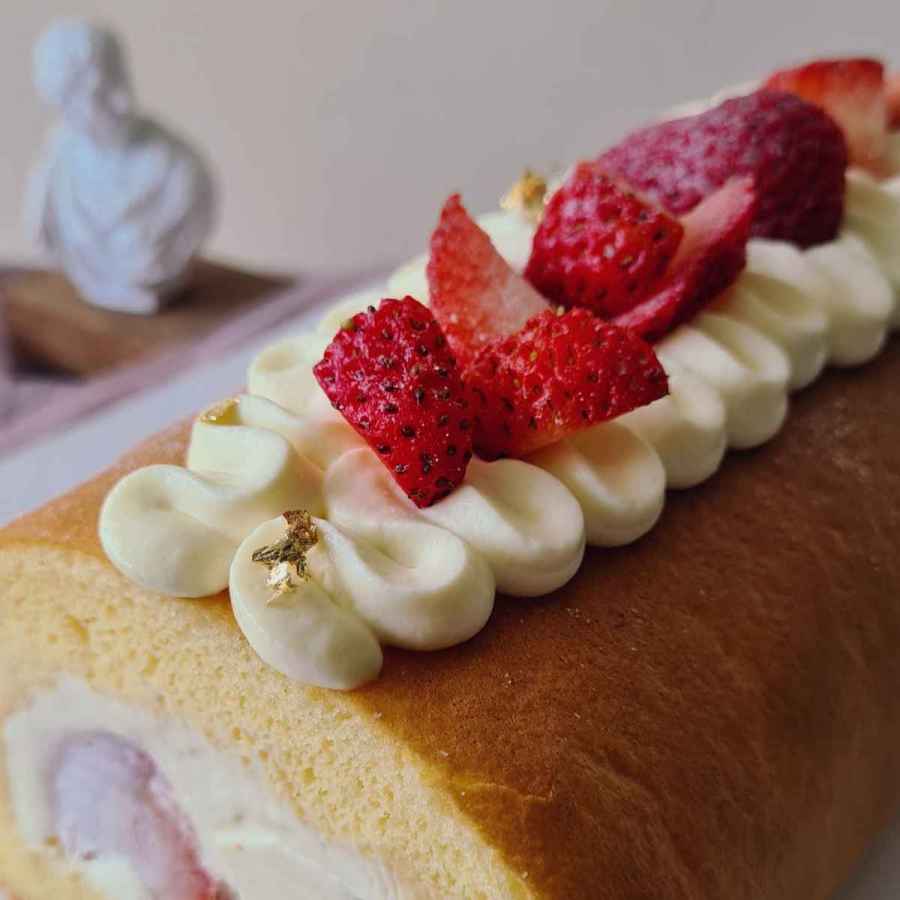 Vanilla swissroll with panna cotta,fresh strawberry and vanilla